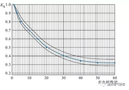 表2和图1是根据实际运行数据,经过数据分析、处理编制而成的。由于电动汽车在不断普及中,各地区普及程度差异较大,实际使用时可根据工程实际情况进行必要的调整。图1的曲线适用于7 kW单相交流充电桩的需要系数取值,其中蓝色实线为平均值曲线,上面黑色线为上限值Kx曲线,下面黑色线为下限值Kx曲线。用于供电干线的负荷计算时,建议取上限值。