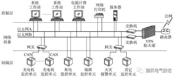 充电设施监控系统由控制层、网络设备及间隔层构成,分为单网结构和双网结构,如图2和图3所示,其分类如表3所示。